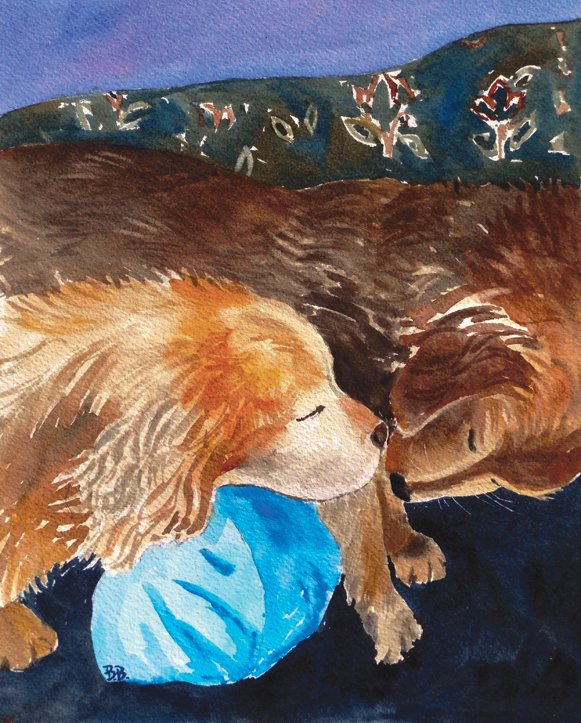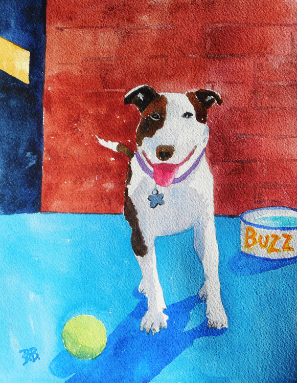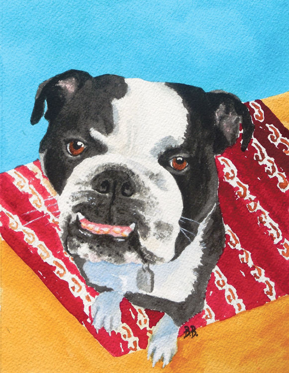 Bourland’s medium is watercolor, which she prefers for its transparent quality and “the fusion that occurs, unlike any other medium.” Watercolor paint means she must work more quickly than artists who choose acrylics or oils. Bourland zeroes in on pet eyes and faces, her goal to convey the pet’s personality through the collective brushstrokes and final painting, which she personalizes with unique traits. Sometimes she will include a special toy, tennis ball, favorite blanket, or other detail she gleans from interviewing the pet parents. Her finished portraits are very appealing: Bourland has an unwavering ability to get the details down, from realistic catchlights in eyes and perfectly pink panting tongues to curly and slick coats and drooping eyes. Even drool.