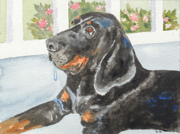 Alameda artist Beth Bourland puts her love for animals into her watercolor portraits. These paintings, top and below, are examples of the portraits she has was commissioned to do. Bourland likes to meet the animals she will be painting, if she can, and then works from photographs. Atop is the beloved hound (also below) whose drool the artist was urged to depict. Her artistic style can be bright and intense or muted and understated.