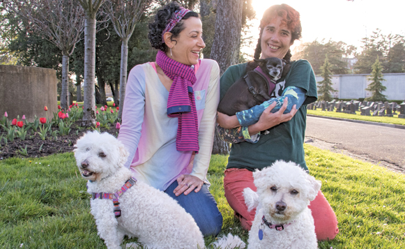Artists Nancy Mizuno Elliott and Laurel Nathanson pose with their dogs Bonnie, Bailey, and Bug, below.