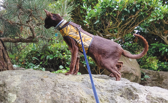One of the joys of a leash-trained cat is being able to take it places that it would otherwise never go: vacations, walks through the neighborhood, strolls through the park, and wilderness walks. But all places aren’t created equal. Areas frequented by dog walkers may not be appropriate. We have a large dog, so our cats aren’t afraid of dogs, but even the most cat-friendly dog may react unpredictably, so be prepared to pick up your cat and carry it past unfamiliar dogs, especially ones that aren’t on leash.